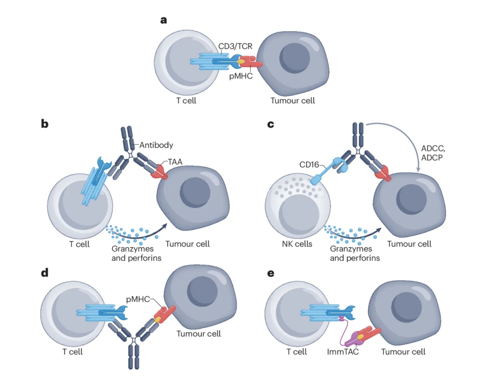 具體來說,靶向T細胞、自然殺傷(NK)細胞或巨噬細胞-粒細胞上表達的抗原的雙特異性抗體,如CD3、CD16(FcγRIIIa)或CD64/SIRPα,能夠使潛在的各種免疫效應細胞選擇性地轉向腫瘤特異性靶抗原。而設計用于靶向一種以上腫瘤特異性細胞表面抗原的雙特異性或多特異性抗體能夠更精確地區分惡性細胞和非惡性細胞,并可能比單克隆抗體更能提高治療活性。