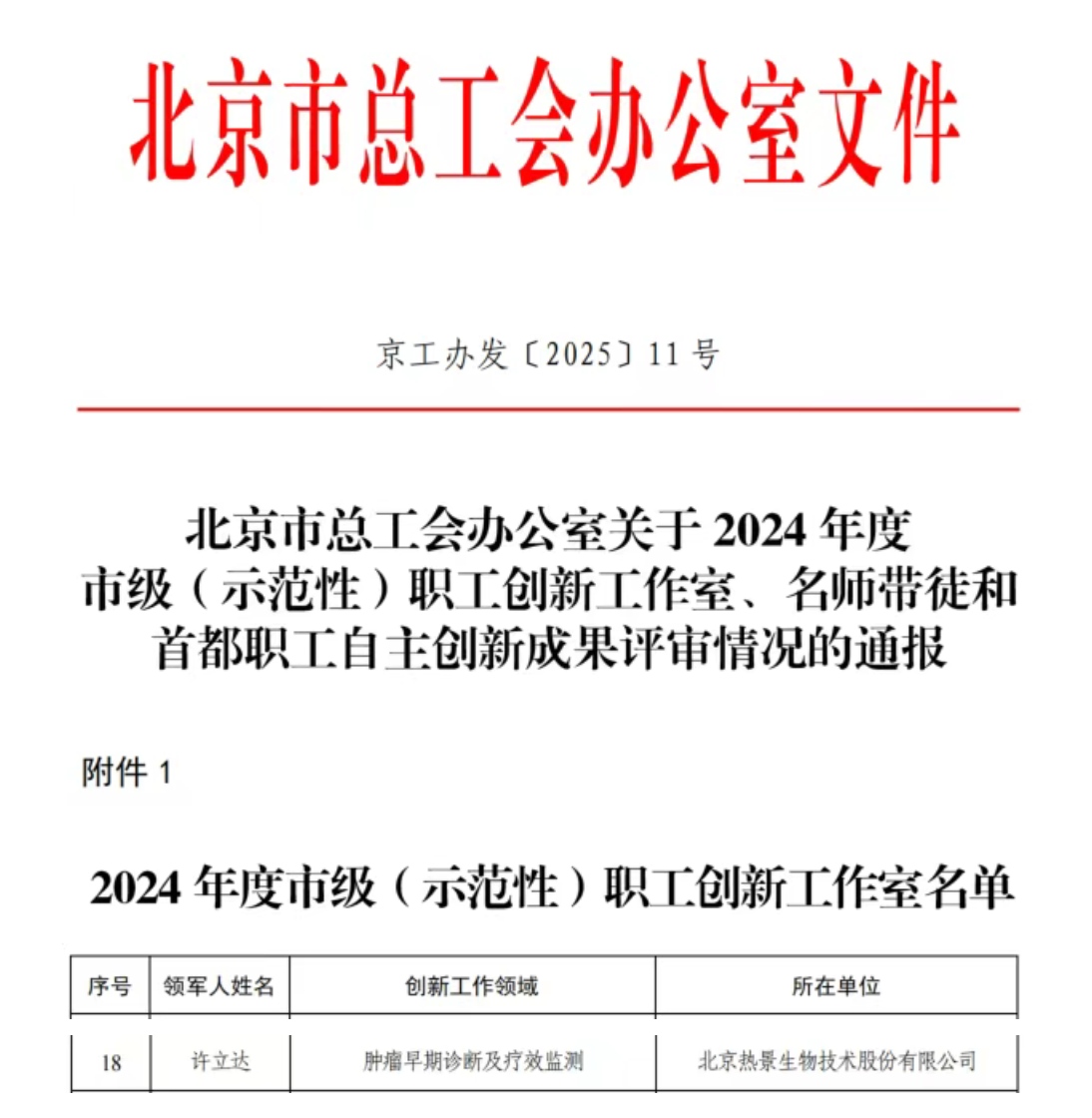 近日,北京市總工會發布《關于2024年度市級(示范性)職工創新工作室、名師帶徒和首都職工自主創新成果評審情況的通報》,熱景生物許立達研究員領軍的“腫瘤早期診斷及療效監測”創新團隊榮獲“北京市級職工創新工作室”稱號,該稱號是對工作室在腫瘤精準診斷領域持續創新與技術轉化卓越貢獻的權威認可。創新驅動腫瘤診斷革新該工作室專注于腫瘤早期診斷與療效監測技術的研發,依托公司核心原創技術,成功搭建起獨具特色的多組學診斷技術平臺,實現外泌體、蛋白、核酸等腫瘤標志物從發現到臨床轉化的貫通,助力腫瘤精準診療。