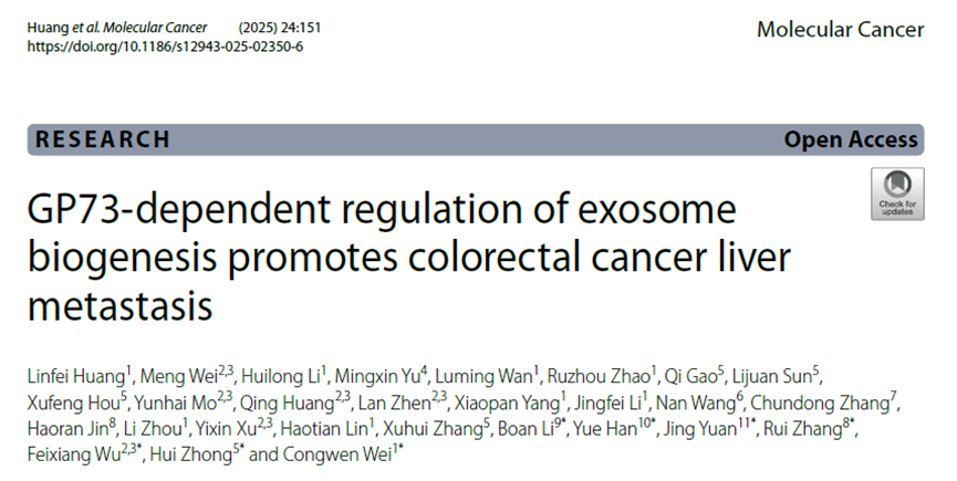 近日,北京堯景基因技術有限公司鐘輝研究員聯合廣西醫科大學附屬腫瘤醫院吳飛翔主任醫師、軍事醫學研究院魏從文研究員、遼寧省腫瘤醫院張睿主任醫師、首都兒科研究所袁靜教授等團隊在Molecular Cancer(影響因子27.7)雜志上發表題為“GP73-dependent regulation of exosome biogenesis promotes colorectal cancer liver metastasis”的重磅文章。